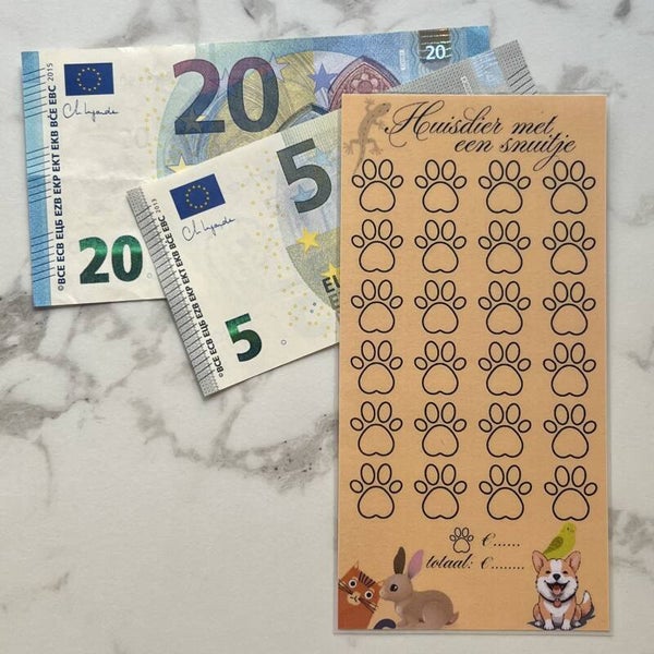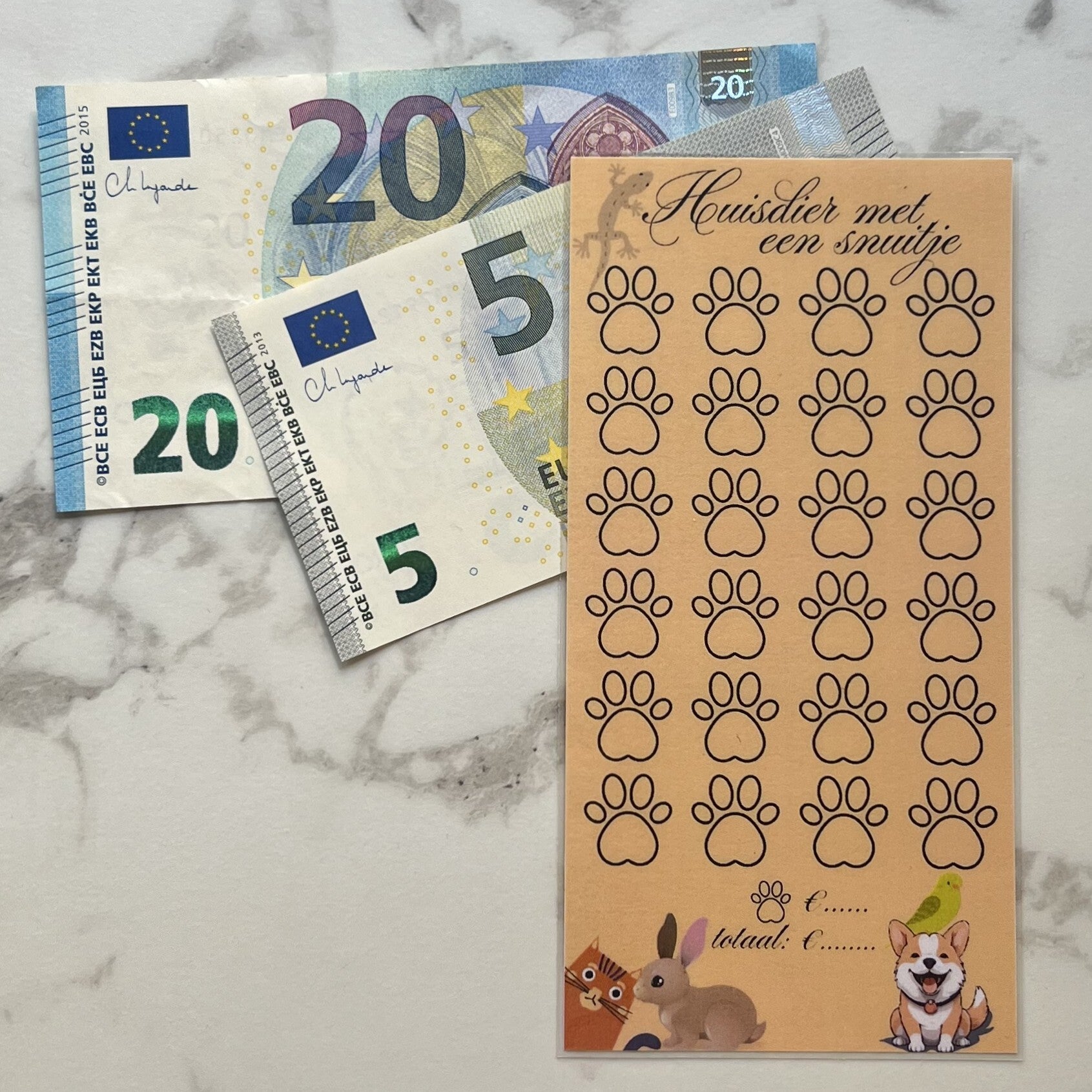 Spaar voor je huisdier! Voeg geld toe, kleur de bijbehorende pootjes in en zie je spaargeld groeien voor de verzorging, speeltjes of andere dromen van je viervoetige, gevleugelde, zwemmende of kruipende maatje.