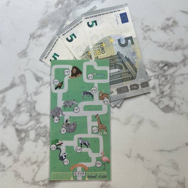 Go wild en spaar voor een dierlijk avontuur! Voeg geld toe, kleur het bijbehorende vakje in en werk toe naar een dag vol dieren, plezier en ontdekkingen in de dierentuin.