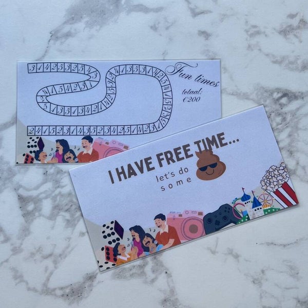 Spaar voor jouw fun times! Voeg geld toe, kleur de bijbehoordende vakjes in en werk toe naar een leuk uitje, een fijne ervaring of een herinnering om nooit te vergeten.