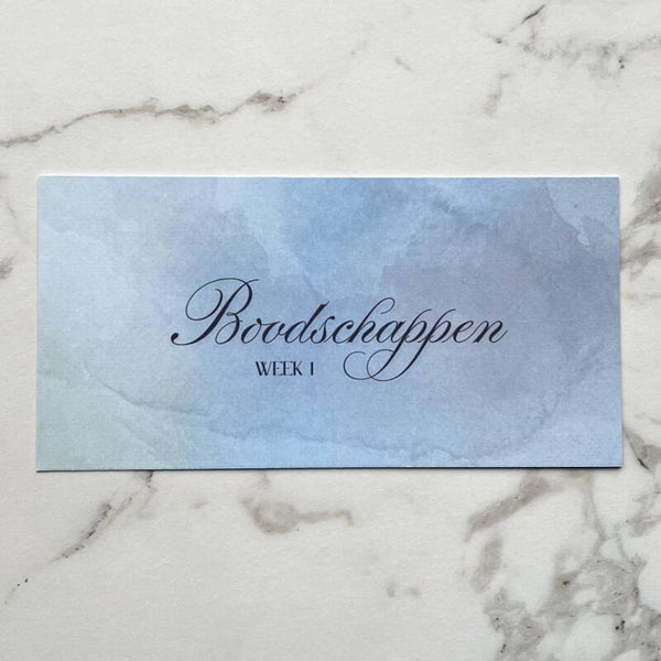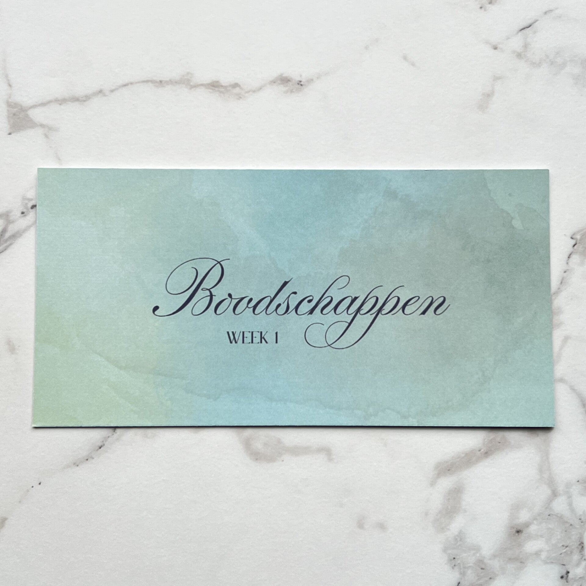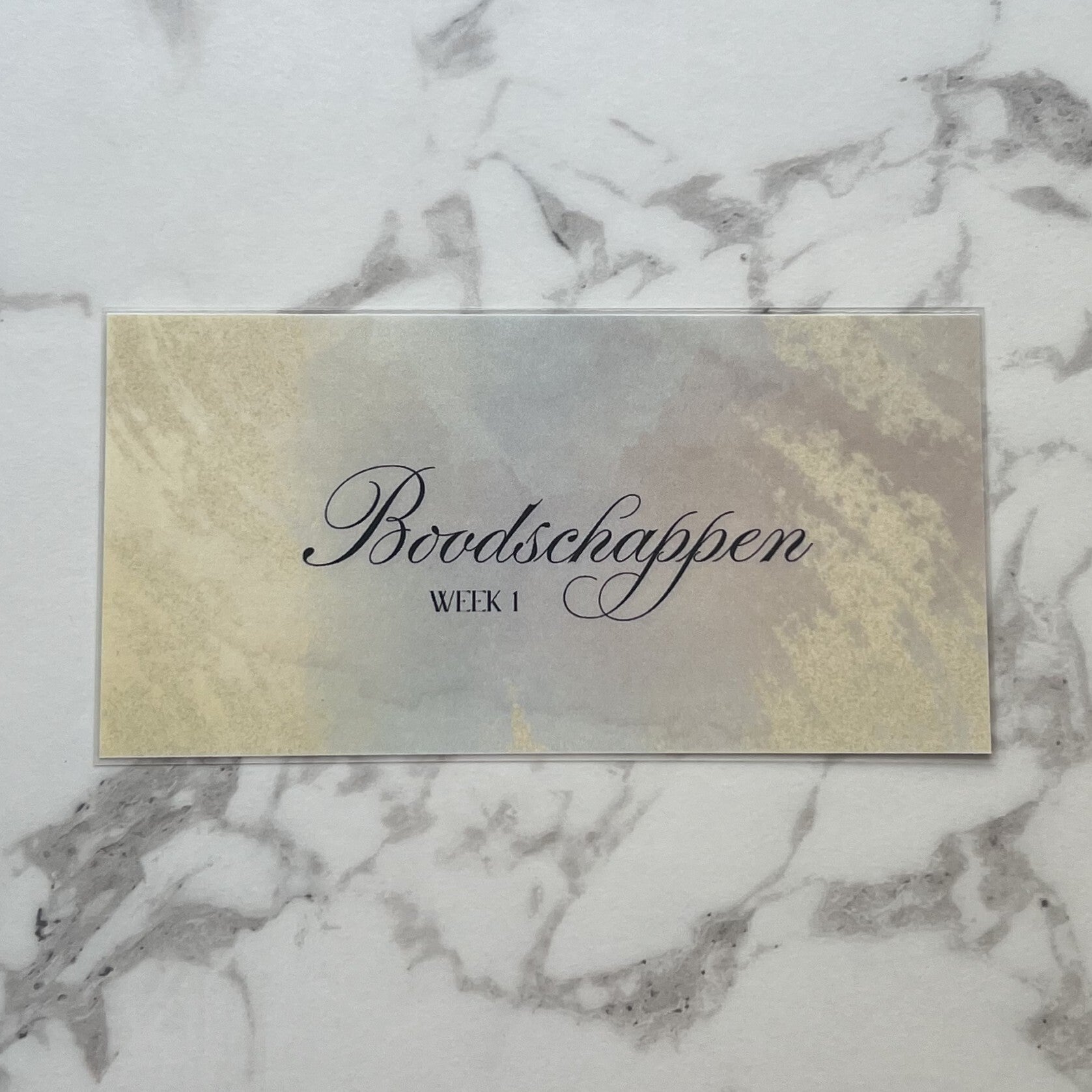 Plan je wekelijkse boodschappenbudget met de 5 weken Cash Boards! Zet per categorie je maximale budget en stop het geld in de bijbehorende mapjes, zo houd je eenvoudig grip op je uitgaven.