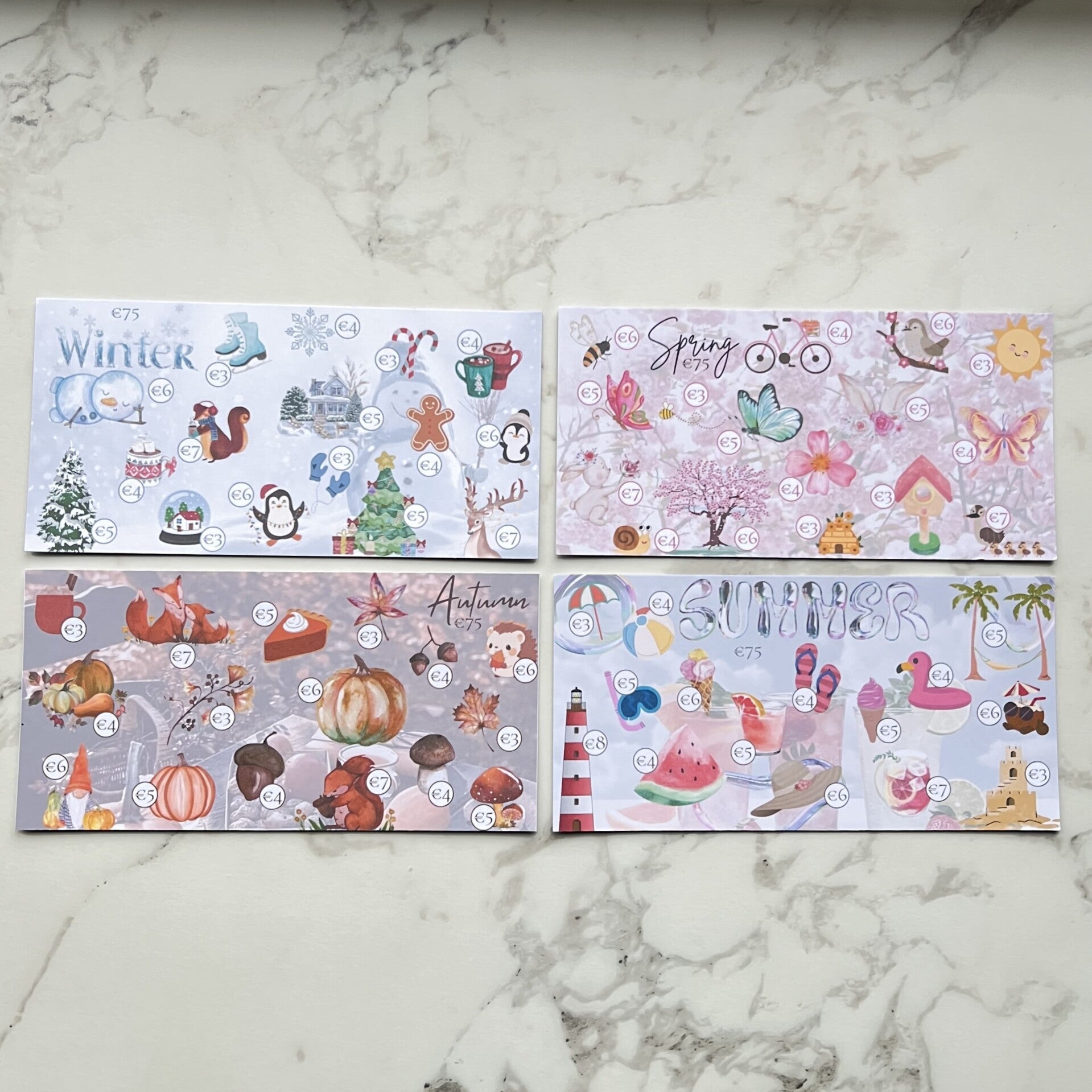 Laat je spaardoelen bloeien per seizoen! Voeg geld toe, kleur de bijbehorende vakjes in en zie je voortgang groeien!
