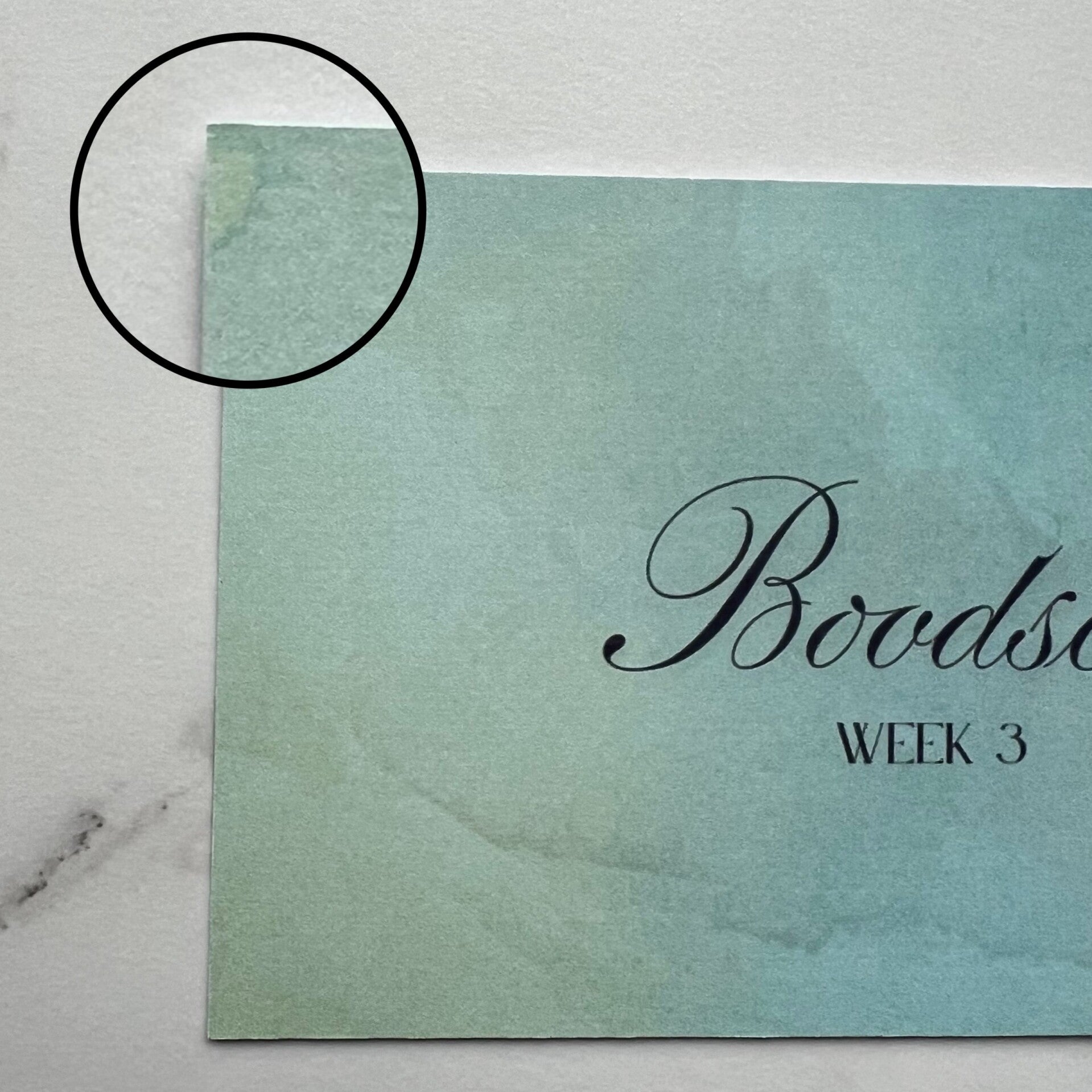Deze cash boards zijn volledig compleet voor boodschappen week 1 t/m 5, maar hebben een klein watervlekje in het hoekje van week 3 (zie foto). Functioneel zijn ze helemaal perfect en klaar om je weekelijke boodschappenbudget overzichtelijk te houden. Ideaal voor wie een 2e kansje niet erg vindt!